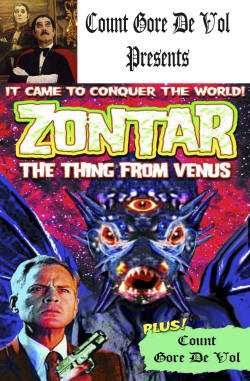 Venus A Larry Buchanan film about a misguided scientist who enables an alien from Venus named Zontar to come to earth in order to help solve man's problems. However, Zontar has other ideas, like taking over the world. Count Gore De Vol gives you the interesting and convoluted history of this film. This is a truly must see Cheezy Movie. so bad it's wonderful! |